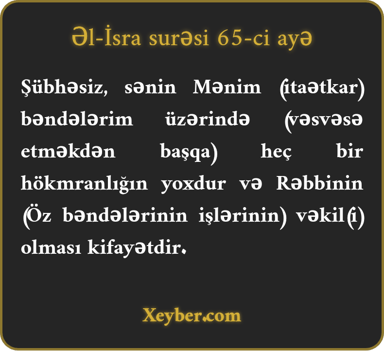 Şübhəsiz, sənin Mənim (itaətkar) bəndələrim üzərində (vəsvəsə etməkdən başqa) heç bir hökmranlığın yoxdur və Rəbbinin (Öz bəndələrinin işlərinin) vəkil(i) olması kifayətdir.