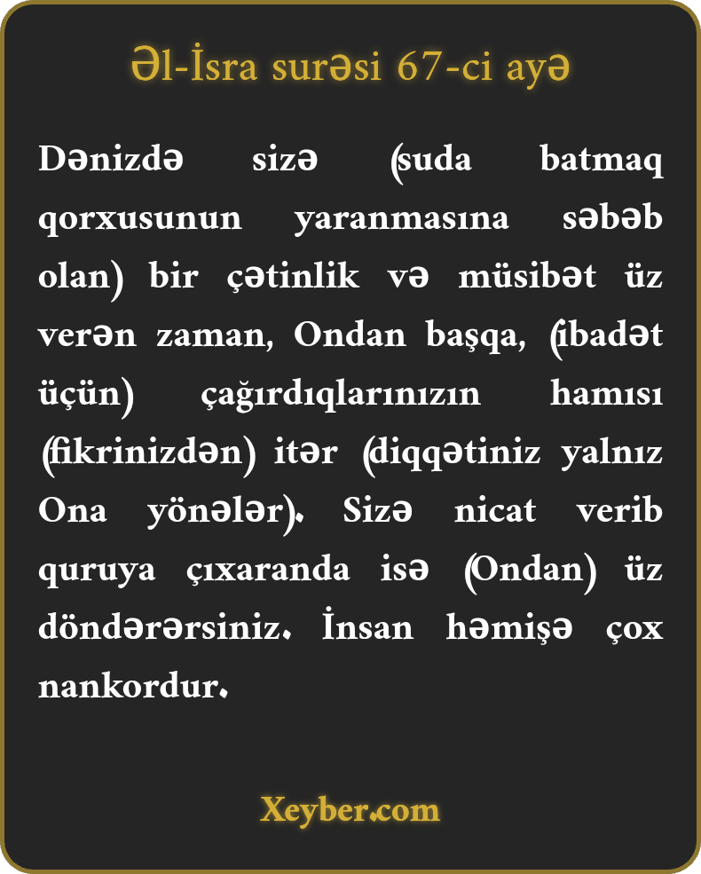 Dənizdə sizə (suda batmaq qorxusunun yaranmasına səbəb olan) bir çətinlik və müsibət üz verən zaman, Ondan başqa, (ibadət üçün) çağırdıqlarınızın hamısı (fikrinizdən) itər (diqqətiniz yalnız Ona yönələr). Sizə nicat verib quruya çıxaranda isə (Ondan) üz döndərərsiniz. İnsan həmişə çox nankordur.