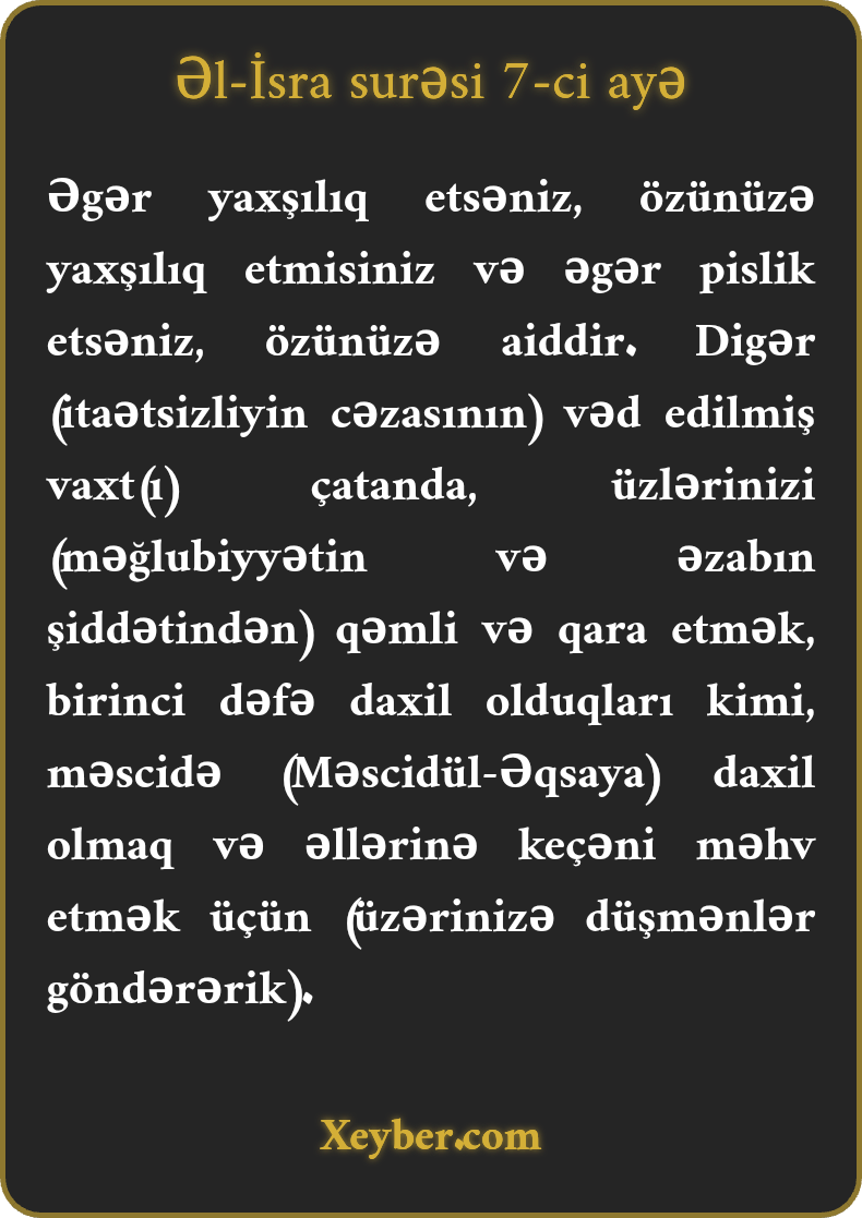 Əgər yaxşılıq etsəniz, özünüzə yaxşılıq etmisiniz və əgər pislik etsəniz, özünüzə aiddir. Digər (itaətsizliyin cəzasının) vəd edilmiş vaxt(ı) çatanda, üzlərinizi (məğlubiyyətin və əzabın şiddətindən) qəmli və qara etmək, birinci dəfə daxil olduqları kimi, məscidə (Məscidül-Əqsaya) daxil olmaq və əllərinə keçəni məhv etmək üçün (üzərinizə düşmənlər göndərərik).