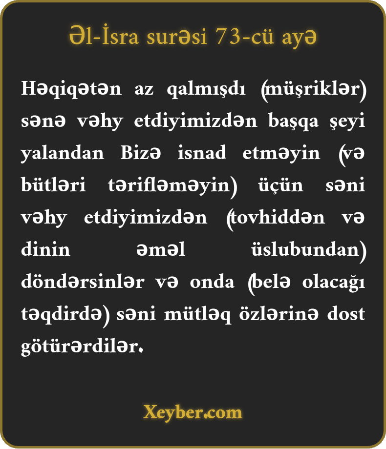 Həqiqətən az qalmışdı (müşriklər) sənə vəhy etdiyimizdən başqa şeyi yalandan Bizə isnad etməyin (və bütləri tərifləməyin) üçün səni vəhy etdiyimizdən (tovhiddən və dinin əməl üslubundan) döndərsinlər və onda (belə olacağı təqdirdə) səni mütləq özlərinə dost götürərdilər.