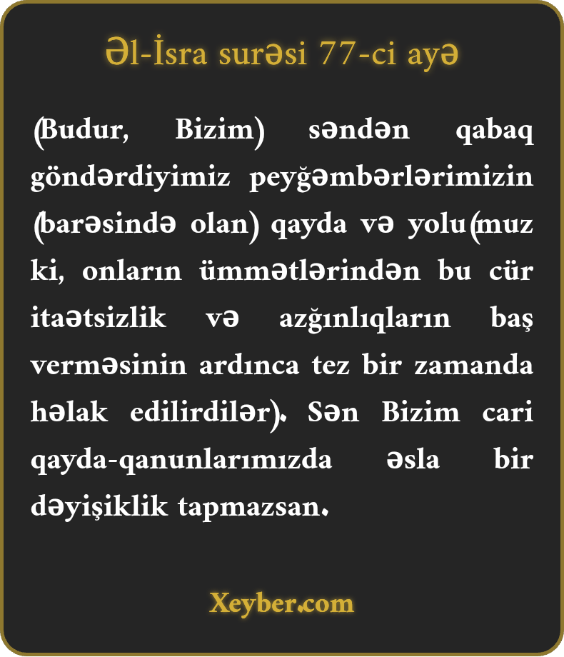(Budur, Bizim) səndən qabaq göndərdiyimiz peyğəmbərlərimizin (barəsində olan) qayda və yolu(muz ki, onların ümmətlərindən bu cür itaətsizlik və azğınlıqların baş verməsinin ardınca tez bir zamanda həlak edilirdilər). Sən Bizim cari qayda-qanunlarımızda əsla bir dəyişiklik tapmazsan.