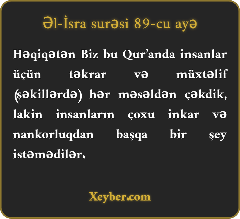 Həqiqətən Biz bu Qur’anda insanlar üçün təkrar və müxtəlif (şəkillərdə) hər məsəldən çəkdik, lakin insanların çoxu inkar və nankorluqdan başqa bir şey istəmədilər.