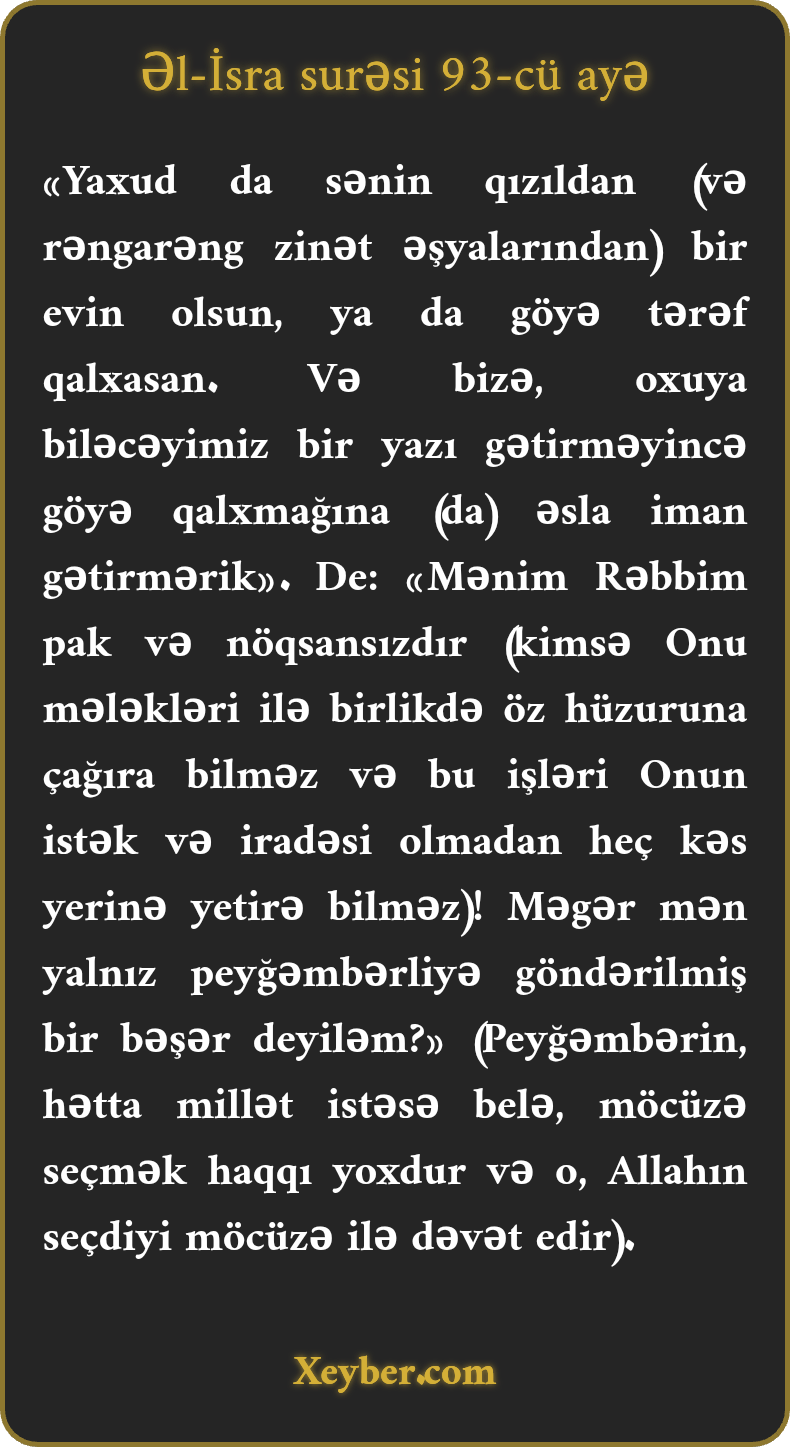 «Yaxud da sənin qızıldan (və rəngarəng zinət əşyalarından) bir evin olsun, ya da göyə tərəf qalxasan. Və bizə, oxuya biləcəyimiz bir yazı gətirməyincə göyə qalxmağına (da) əsla iman gətirmərik». De: «Mənim Rəbbim pak və nöqsansızdır (kimsə Onu mələkləri ilə birlikdə öz hüzuruna çağıra bilməz və bu işləri Onun istək və iradəsi olmadan heç kəs yerinə yetirə bilməz)! Məgər mən yalnız peyğəmbərliyə göndərilmiş bir bəşər deyiləm?» (Peyğəmbərin, hətta millət istəsə belə, möcüzə seçmək haqqı yoxdur və o, Allahın seçdiyi möcüzə ilə dəvət edir).