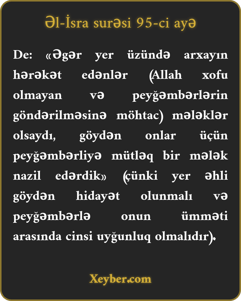 De: «Əgər yer üzündə arxayın hərəkət edənlər (Allah xofu olmayan və peyğəmbərlərin göndərilməsinə möhtac) mələklər olsaydı, göydən onlar üçün peyğəmbərliyə mütləq bir mələk nazil edərdik» (çünki yer əhli göydən hidayət olunmalı və peyğəmbərlə onun ümməti arasında cinsi uyğunluq olmalıdır).