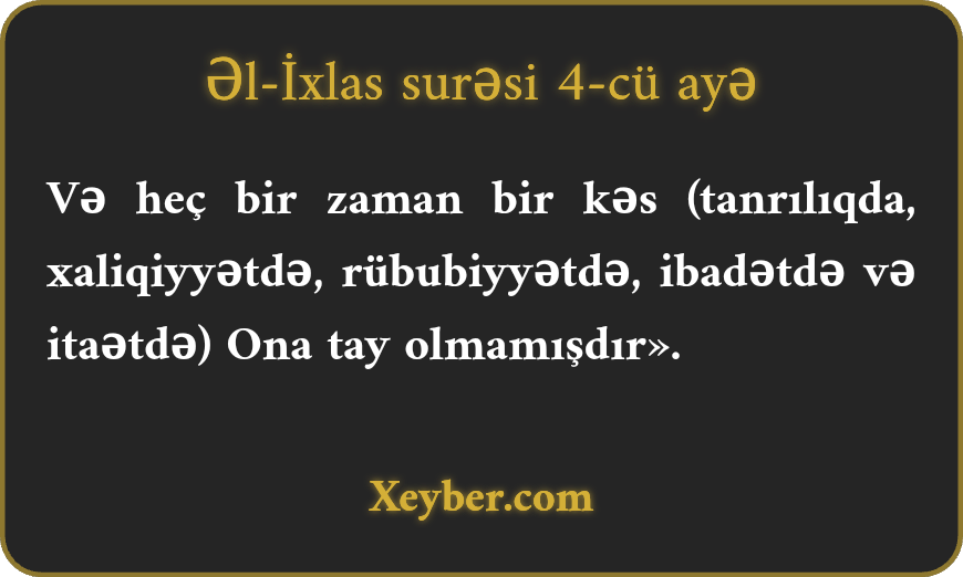 Və heç bir zaman bir kəs (tanrılıqda, xaliqiyyətdə, rübubiyyətdə, ibadətdə və itaətdə) Ona tay olmamışdır».