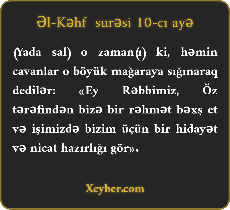 (Yada sal) o zaman(ı) ki, həmin cavanlar o böyük mağaraya sığınaraq dedilər: «Ey Rəbbimiz, Öz tərəfindən bizə bir rəhmət bəxş et və işimizdə bizim üçün bir hidayət və nicat hazırlığı gör».