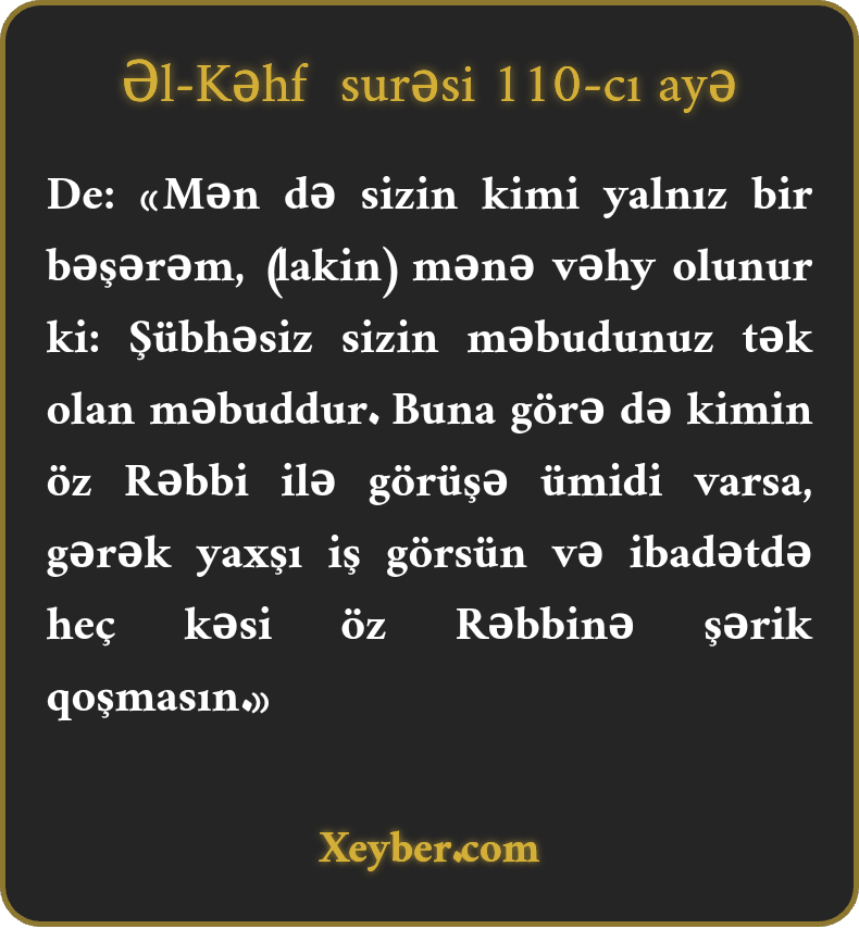 De: «Mən də sizin kimi yalnız bir bəşərəm, (lakin) mənə vəhy olunur ki: Şübhəsiz sizin məbudunuz tək olan məbuddur. Buna görə də kimin öz Rəbbi ilə görüşə ümidi varsa, gərək yaxşı iş görsün və ibadətdə heç kəsi öz Rəbbinə şərik qoşmasın.»