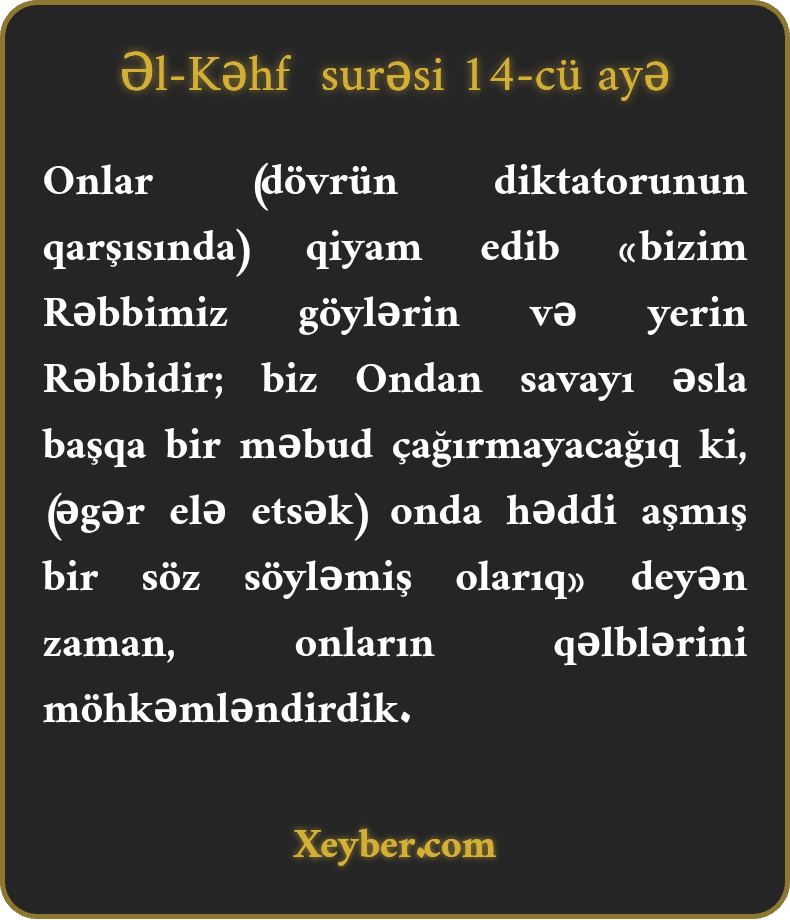 Onlar (dövrün diktatorunun qarşısında) qiyam edib «bizim Rəbbimiz göylərin və yerin Rəbbidir; biz Ondan savayı əsla başqa bir məbud çağırmayacağıq ki, (əgər elə etsək) onda həddi aşmış bir söz söyləmiş olarıq» deyən zaman, onların qəlblərini möhkəmləndirdik.