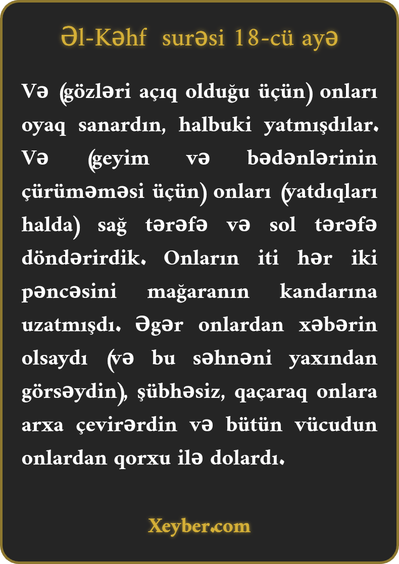 Və (gözləri açıq olduğu üçün) onları oyaq sanardın, halbuki yatmışdılar. Və (geyim və bədənlərinin çürüməməsi üçün) onları (yatdıqları halda) sağ tərəfə və sol tərəfə döndərirdik. Onların iti hər iki pəncəsini mağaranın kandarına uzatmışdı. Əgər onlardan xəbərin olsaydı (və bu səhnəni yaxından görsəydin), şübhəsiz, qaçaraq onlara arxa çevirərdin və bütün vücudun onlardan qorxu ilə dolardı.