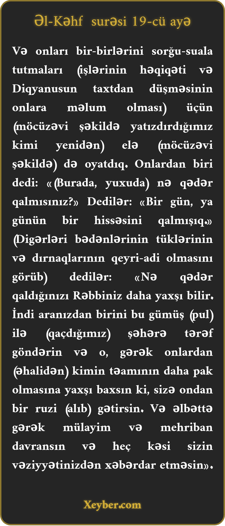 Və onları bir-birlərini sorğu-suala tutmaları (işlərinin həqiqəti və Diqyanusun taxtdan düşməsinin onlara məlum olması) üçün (möcüzəvi şəkildə yatızdırdığımız kimi yenidən) elə (möcüzəvi şəkildə) də oyatdıq. Onlardan biri dedi: «(Burada, yuxuda) nə qədər qalmısınız?» Dedilər: «Bir gün, ya günün bir hissəsini qalmışıq.» (Digərləri bədənlərinin tüklərinin və dırnaqlarının qeyri-adi olmasını görüb) dedilər: «Nə qədər qaldığınızı Rəbbiniz daha yaxşı bilir. İndi aranızdan birini bu gümüş (pul) ilə (qaçdığımız) şəhərə tərəf göndərin və o, gərək onlardan (əhalidən) kimin təamının daha pak olmasına yaxşı baxsın ki, sizə ondan bir ruzi (alıb) gətirsin. Və əlbəttə gərək mülayim və mehriban davransın və heç kəsi sizin vəziyyətinizdən xəbərdar etməsin».