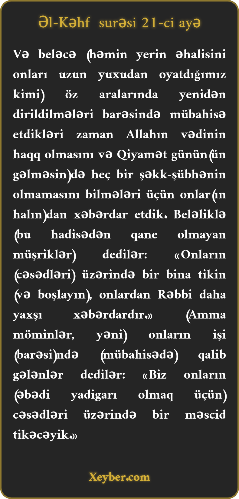 Və beləcə (həmin yerin əhalisini onları uzun yuxudan oyatdığımız kimi) öz aralarında yenidən dirildilmələri barəsində mübahisə etdikləri zaman Allahın vədinin haqq olmasını və Qiyamət günün(ün gəlməsin)də heç bir şəkk-şübhənin olmamasını bilmələri üçün onlar(ın halın)dan xəbərdar etdik. Beləliklə (bu hadisədən qane olmayan müşriklər) dedilər: «Onların (cəsədləri) üzərində bir bina tikin (və boşlayın), onlardan Rəbbi daha yaxşı xəbərdardır.» (Amma möminlər, yəni) onların işi (barəsi)ndə (mübahisədə) qalib gələnlər dedilər: «Biz onların (əbədi yadigarı olmaq üçün) cəsədləri üzərində bir məscid tikəcəyik.»