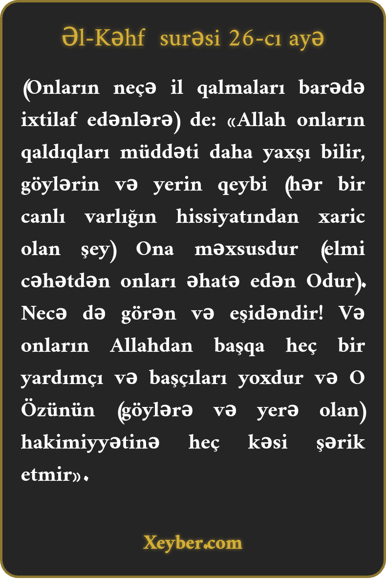 (Onların neçə il qalmaları barədə ixtilaf edənlərə) de: «Allah onların qaldıqları müddəti daha yaxşı bilir, göylərin və yerin qeybi (hər bir canlı varlığın hissiyatından xaric olan şey) Ona məxsusdur (elmi cəhətdən onları əhatə edən Odur). Necə də görən və eşidəndir! Və onların Allahdan başqa heç bir yardımçı və başçıları yoxdur və O Özünün (göylərə və yerə olan) hakimiyyətinə heç kəsi şərik etmir».