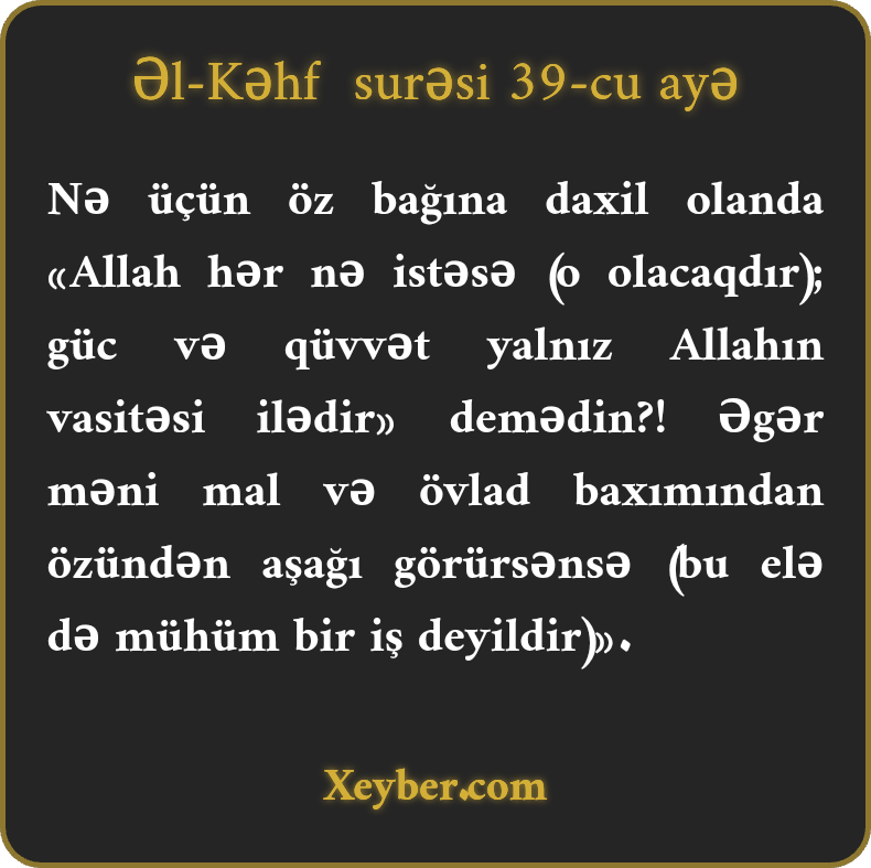 Nə üçün öz bağına daxil olanda «Allah hər nə istəsə (o olacaqdır); güc və qüvvət yalnız Allahın vasitəsi ilədir» demədin?! Əgər məni mal və övlad baxımından özündən aşağı görürsənsə (bu elə də mühüm bir iş deyildir)».