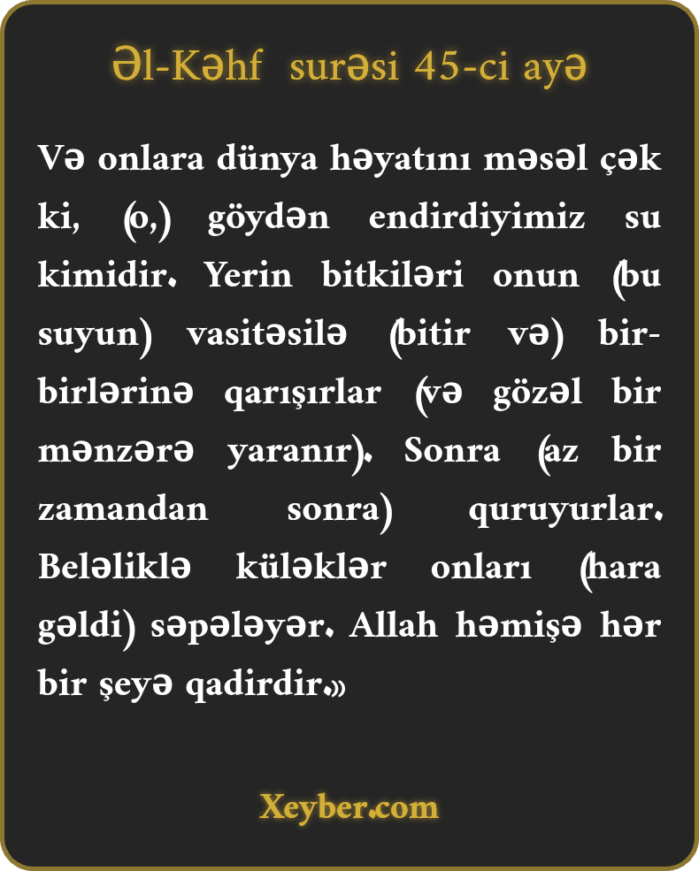 Və onlara dünya həyatını məsəl çək ki, (o,) göydən endirdiyimiz su kimidir. Yerin bitkiləri onun (bu suyun) vasitəsilə (bitir və) bir-birlərinə qarışırlar (və gözəl bir mənzərə yaranır). Sonra (az bir zamandan sonra) quruyurlar. Beləliklə küləklər onları (hara gəldi) səpələyər. Allah həmişə hər bir şeyə qadirdir.»