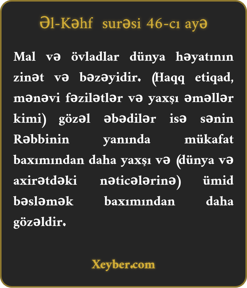 Mal və övladlar dünya həyatının zinət və bəzəyidir. (Haqq etiqad, mənəvi fəzilətlər və yaxşı əməllər kimi) gözəl əbədilər isə sənin Rəbbinin yanında mükafat baxımından daha yaxşı və (dünya və axirətdəki nəticələrinə) ümid bəsləmək baxımından daha gözəldir.
