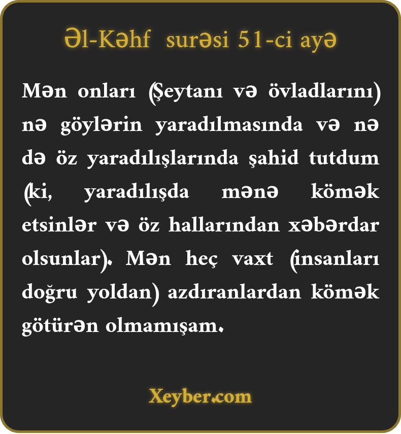 Mən onları (Şeytanı və övladlarını) nə göylərin yaradılmasında və nə də öz yaradılışlarında şahid tutdum (ki, yaradılışda mənə kömək etsinlər və öz hallarından xəbərdar olsunlar). Mən heç vaxt (insanları doğru yoldan) azdıranlardan kömək götürən olmamışam.