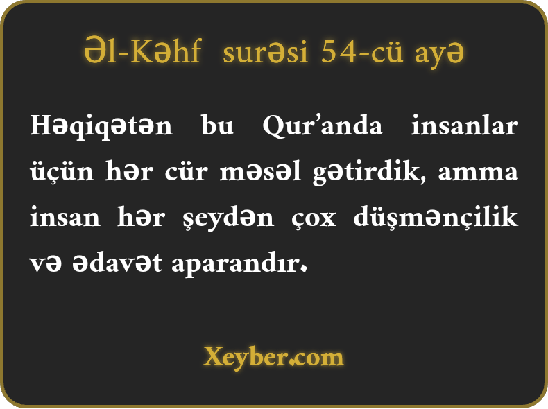 Həqiqətən bu Qur’anda insanlar üçün hər cür məsəl gətirdik, amma insan hər şeydən çox düşmənçilik və ədavət aparandır.