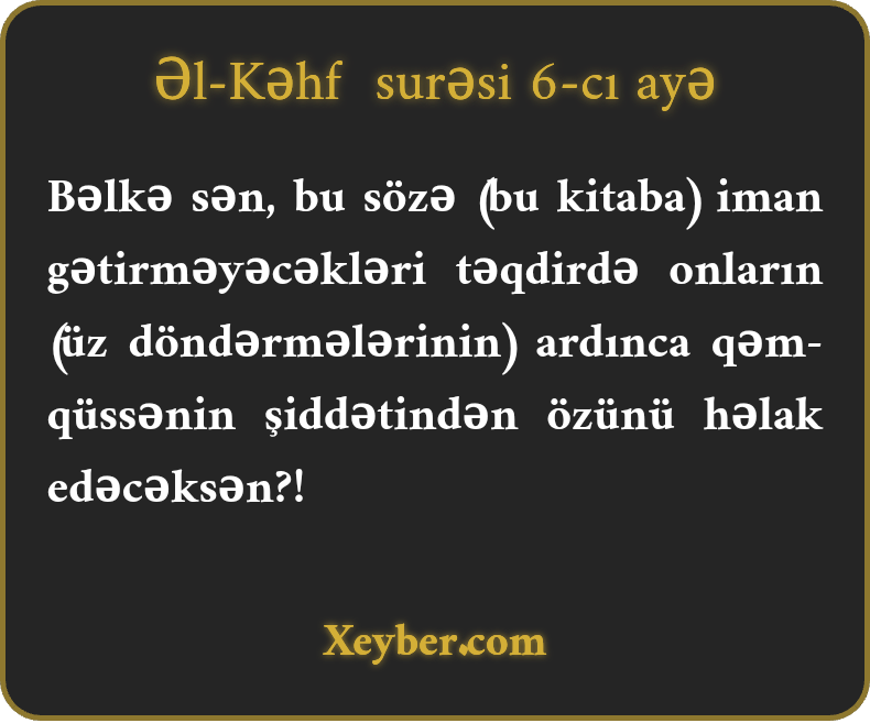 Bəlkə sən, bu sözə (bu kitaba) iman gətirməyəcəkləri təqdirdə onların (üz döndərmələrinin) ardınca qəm-qüssənin şiddətindən özünü həlak edəcəksən?!