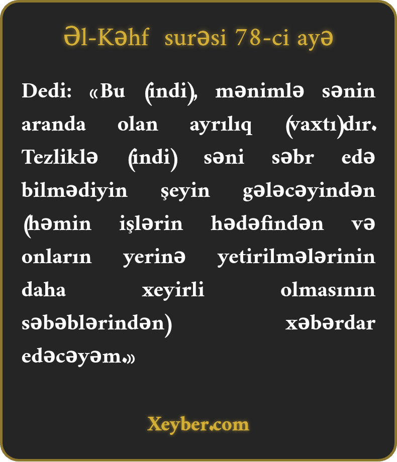 Dedi: «Bu (indi), mənimlə sənin aranda olan ayrılıq (vaxtı)dır. Tezliklə (indi) səni səbr edə bilmədiyin şeyin gələcəyindən (həmin işlərin hədəfindən və onların yerinə yetirilmələrinin daha xeyirli olmasının səbəblərindən) xəbərdar edəcəyəm.»