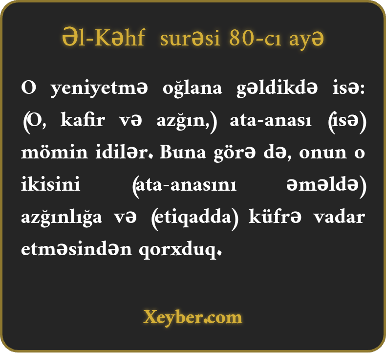 O yeniyetmə oğlana gəldikdə isə: (O, kafir və azğın,) ata-anası (isə) mömin idilər. Buna görə də, onun o ikisini (ata-anasını əməldə) azğınlığa və (etiqadda) küfrə vadar etməsindən qorxduq.