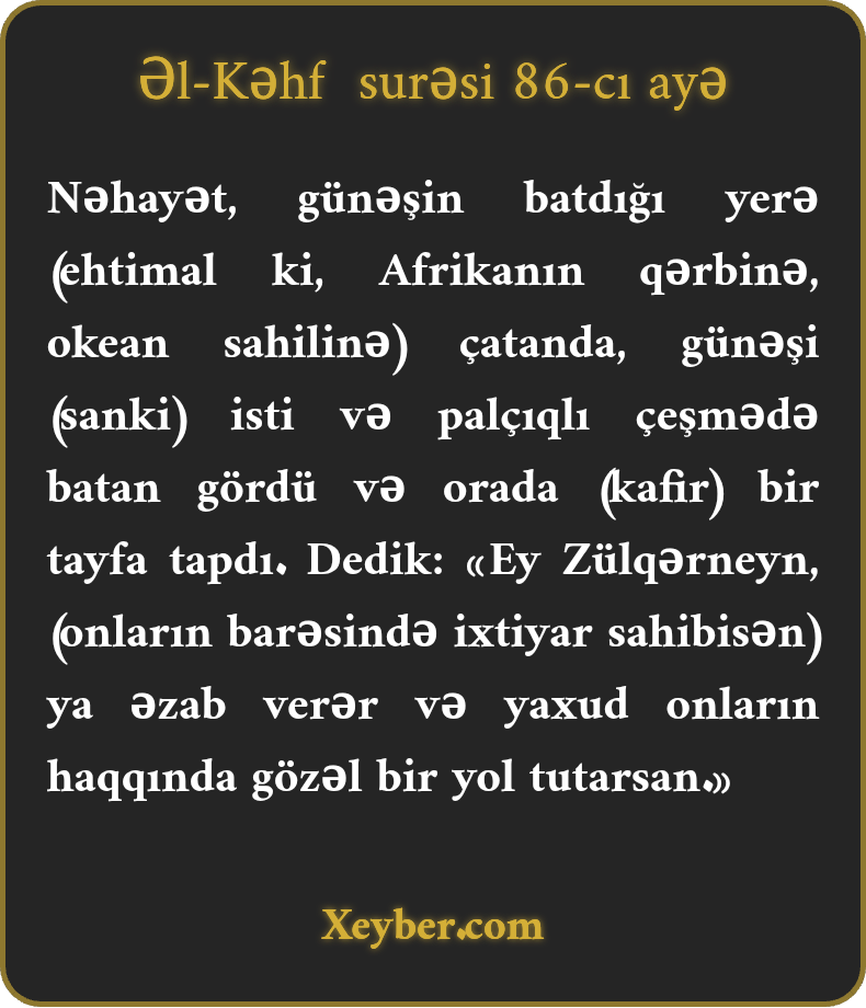 Nəhayət, günəşin batdığı yerə (ehtimal ki, Afrikanın qərbinə, okean sahilinə) çatanda, günəşi (sanki) isti və palçıqlı çeşmədə batan gördü və orada (kafir) bir tayfa tapdı. Dedik: «Ey Zülqərneyn, (onların barəsində ixtiyar sahibisən) ya əzab verər və yaxud onların haqqında gözəl bir yol tutarsan.»