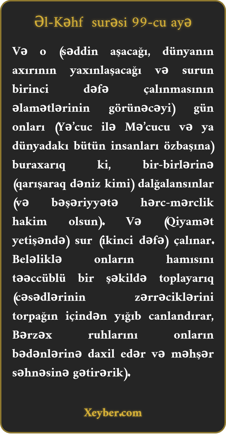 Və o (səddin aşacağı, dünyanın axırının yaxınlaşacağı və surun birinci dəfə çalınmasının əlamətlərinin görünəcəyi) gün onları (Yə’cuc ilə Mə’cucu və ya dünyadakı bütün insanları özbaşına) buraxarıq ki, bir-birlərinə (qarışaraq dəniz kimi) dalğalansınlar (və bəşəriyyətə hərc-mərclik hakim olsun). Və (Qiyamət yetişəndə) sur (ikinci dəfə) çalınar. Beləliklə onların hamısını təəccüblü bir şəkildə toplayarıq (cəsədlərinin zərrəciklərini torpağın içindən yığıb canlandırar, Bərzəx ruhlarını onların bədənlərinə daxil edər və məhşər səhnəsinə gətirərik).