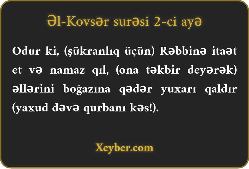 Odur ki, (şükranlıq üçün) Rəbbinə itaət et və namaz qıl, (ona təkbir deyərək) əllərini boğazına qədər yuxarı qaldır (yaxud dəvə qurbanı kəs!).