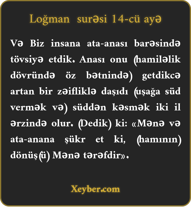 Və Biz insana ata-anası barəsində tövsiyə etdik. Anası onu (hamiləlik dövründə öz bətnində) getdikcə artan bir zəifliklə daşıdı (uşağa süd vermək və) süddən kəsmək iki il ərzində olur. (Dedik) ki: «Mənə və ata-anana şükr et ki, (hamının) dönüş(ü) Mənə tərəfdir».