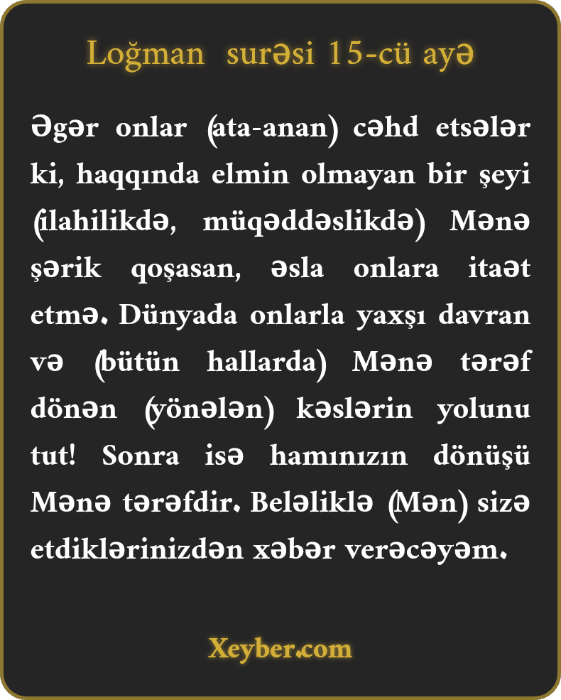 Əgər onlar (ata-anan) cəhd etsələr ki, haqqında elmin olmayan bir şeyi (ilahilikdə, müqəddəslikdə) Mənə şərik qoşasan, əsla onlara itaət etmə. Dünyada onlarla yaxşı davran və (bütün hallarda) Mənə tərəf dönən (yönələn) kəslərin yolunu tut! Sonra isə hamınızın dönüşü Mənə tərəfdir. Beləliklə (Mən) sizə etdiklərinizdən xəbər verəcəyəm.