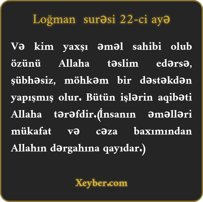 Və kim yaxşı əməl sahibi olub özünü Allaha təslim edərsə, şübhəsiz, möhkəm bir dəstəkdən yapışmış olur. Bütün işlərin aqibəti Allaha tərəfdir.(İnsanın əməlləri mükafat və cəza baxımından Allahın dərgahına qayıdar.)