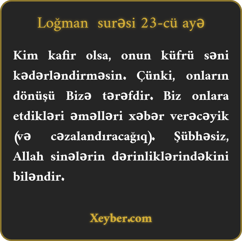 Kim kafir olsa, onun küfrü səni kədərləndirməsin. Çünki, onların dönüşü Bizə tərəfdir. Biz onlara etdikləri əməlləri xəbər verəcəyik (və cəzalandıracağıq). Şübhəsiz, Allah sinələrin dərinliklərindəkini biləndir.