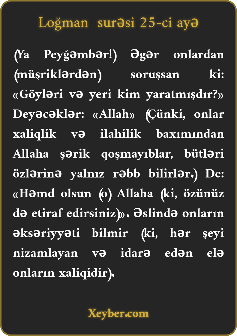 (Ya Peyğəmbər!) Əgər onlardan (müşriklərdən) soruşsan ki: «Göyləri və yeri kim yaratmışdır?» Deyəcəklər: «Allah» (Çünki, onlar xaliqlik və ilahilik baxımından Allaha şərik qoşmayıblar, bütləri özlərinə yalnız rəbb bilirlər.) De: «Həmd olsun (o) Allaha (ki, özünüz də etiraf edirsiniz)». Əslində onların əksəriyyəti bilmir (ki, hər şeyi nizamlayan və idarə edən elə onların xaliqidir).