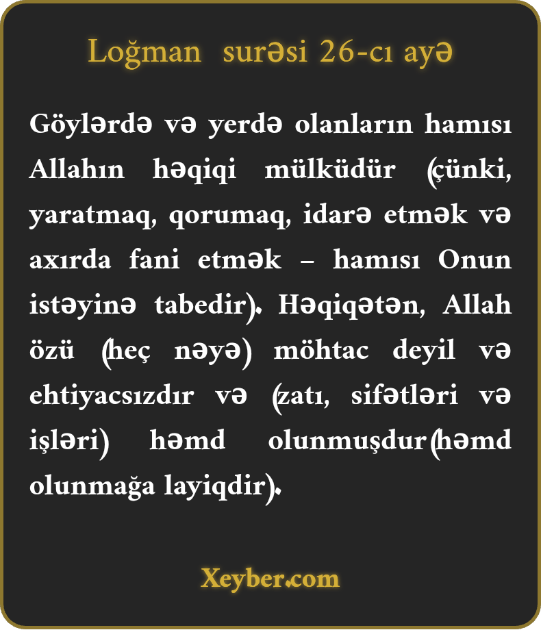 Göylərdə və yerdə olanların hamısı Allahın həqiqi mülküdür (çünki, yaratmaq, qorumaq, idarə etmək və axırda fani etmək – hamısı Onun istəyinə tabedir). Həqiqətən, Allah özü (heç nəyə) möhtac deyil və ehtiyacsızdır və (zatı, sifətləri və işləri) həmd olunmuşdur(həmd olunmağa layiqdir).