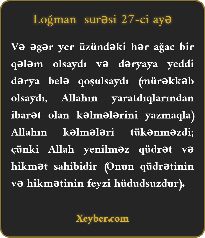Və əgər yer üzündəki hər ağac bir qələm olsaydı və dəryaya yeddi dərya belə qoşulsaydı (mürəkkəb olsaydı, Allahın yaratdıqlarından ibarət olan kəlmələrini yazmaqla) Allahın kəlmələri tükənməzdi; çünki Allah yenilməz qüdrət və hikmət sahibidir (Onun qüdrətinin və hikmətinin feyzi hüdudsuzdur).
