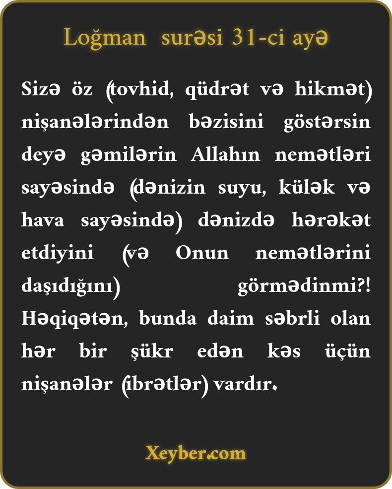 Sizə öz (tovhid, qüdrət və hikmət) nişanələrindən bəzisini göstərsin deyə gəmilərin Allahın nemətləri sayəsində (dənizin suyu, külək və hava sayəsində) dənizdə hərəkət etdiyini (və Onun nemətlərini daşıdığını) görmədinmi?! Həqiqətən, bunda daim səbrli olan hər bir şükr edən kəs üçün nişanələr (ibrətlər) vardır.