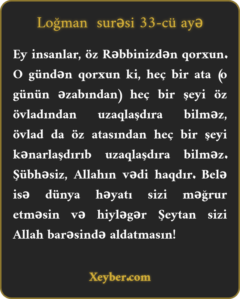 Ey insanlar, öz Rəbbinizdən qorxun. O gündən qorxun ki, heç bir ata (o günün əzabından) heç bir şeyi öz övladından uzaqlaşdıra bilməz, övlad da öz atasından heç bir şeyi kənarlaşdırıb uzaqlaşdıra bilməz. Şübhəsiz, Allahın vədi haqdır. Belə isə dünya həyatı sizi məğrur etməsin və hiyləgər Şeytan sizi Allah barəsində aldatmasın!