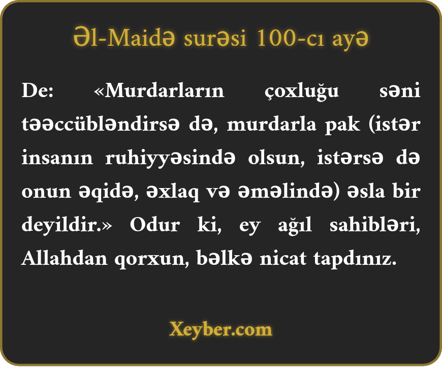 "(Xalqa) de ki, xəbisin (napakın) sayı səni heyrətə gətirsə də xəbislə (napakla) pak eyni deyil. Ey düşüncə sahibləri! Allahdan qorxun, bəlkə nicat tapasınız.”