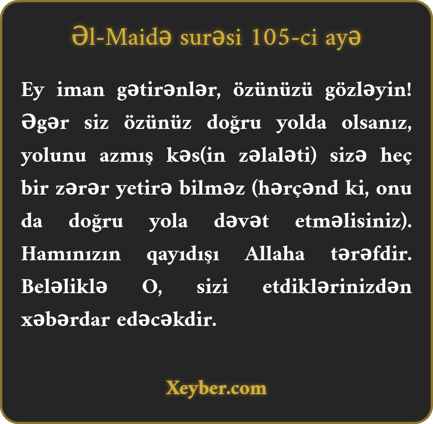 "Ey iman gətirənlər! Özünüzü qoruyun. Çünki siz hidayət oldunuz. Yolunu azan isə sizə ziyan yetirməz. Sizin hamınızın qayıdışı Allaha doğrudur. O sizi etdiyiniz işlərdən agah edər.”