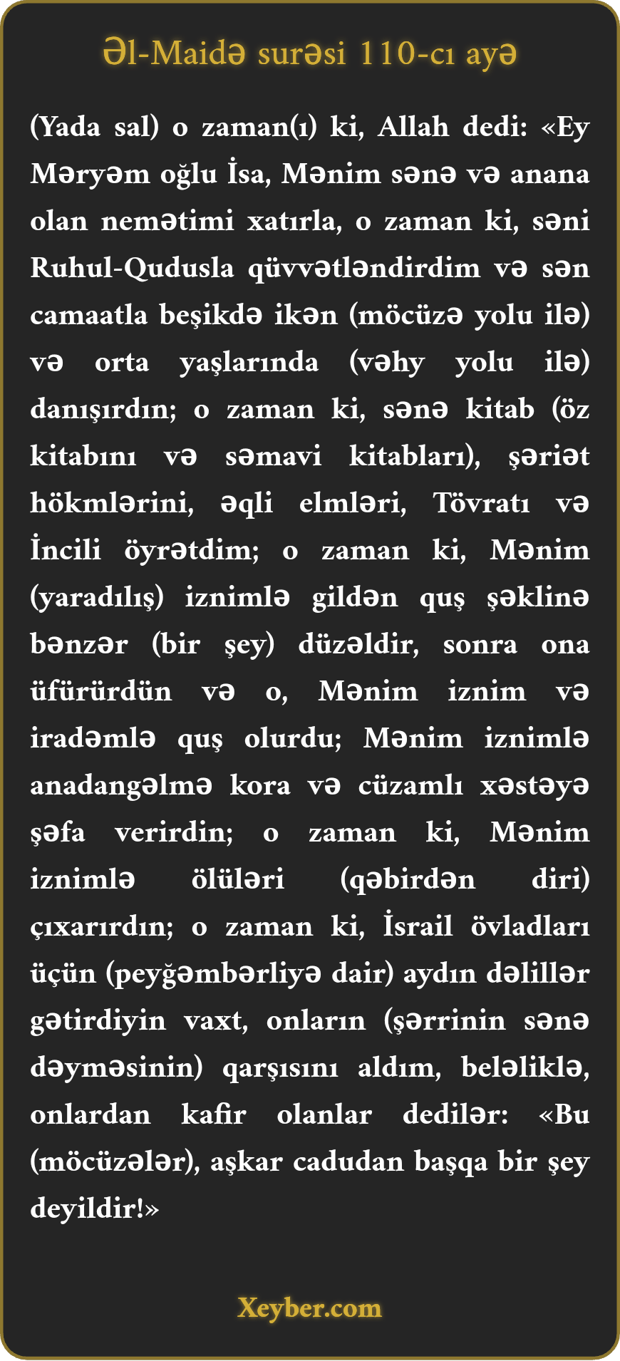 "O zaman ki, Allah buyurdu: "Ey Məryəm oğlu İsa! Nemətimi özünə və anana xatırlat, o vaxt ki, səni Ruhul-qüdslə (Cəbraillə) təsdiqlədim. Beşikdə və böyüdükdən sonra (vəhylə) xalqla danışdın. O vaxt ki, sənə Kitab, Hikmət, Tövrat və İncil öyrətdim. (Unutma o zamanı ki, (Mənim iznimlə gildən quş şəklində bir şey düzəltdin və ona üfürdün, sonra Mənim iznimlə o, quş oldu. Mənim iznimlə anadangəlmə koru və cüzam xəstəsini sağaltdın. O vaxt ki, Mənim iznimlə ölüləri qəbirdən (diri) çıxartdın. Yada sal, o zaman ki, Bəni-İsrailin sənə (zülm əlini) kəsdim. O zaman ki, sən onlar üçün aydın dəlillər gətirdin. Onlardan kafir olanlar (sənin möcüzələrin haqqında) dedilər: Bu, aşkar sehrdən başqa bir şey deyil.”