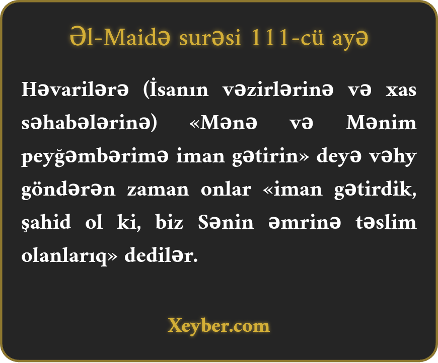 "(Xatırla,) o zaman ki, həvarilərə (həzrət İsanın xüsusi yoldaşlarına) "iman gətirin” deyə vəhy göndərdik, dedilər: İman gətirmişik və şahid ol ki, biz (müsəlman) təslim olmuşuq.”