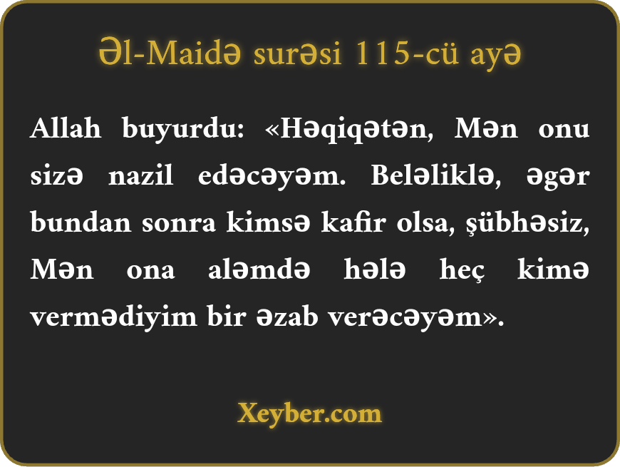 "Allah buyurdu: "Mən onu (maidəni) sizin üçün nazil edərəm. Amma bundan sonra sizdən hər hansınız küfr etsə, ona elə bir əzab verəcəyəm ki, aləmdəkilərdən heç birinə o cür əzab verməmişəm.”