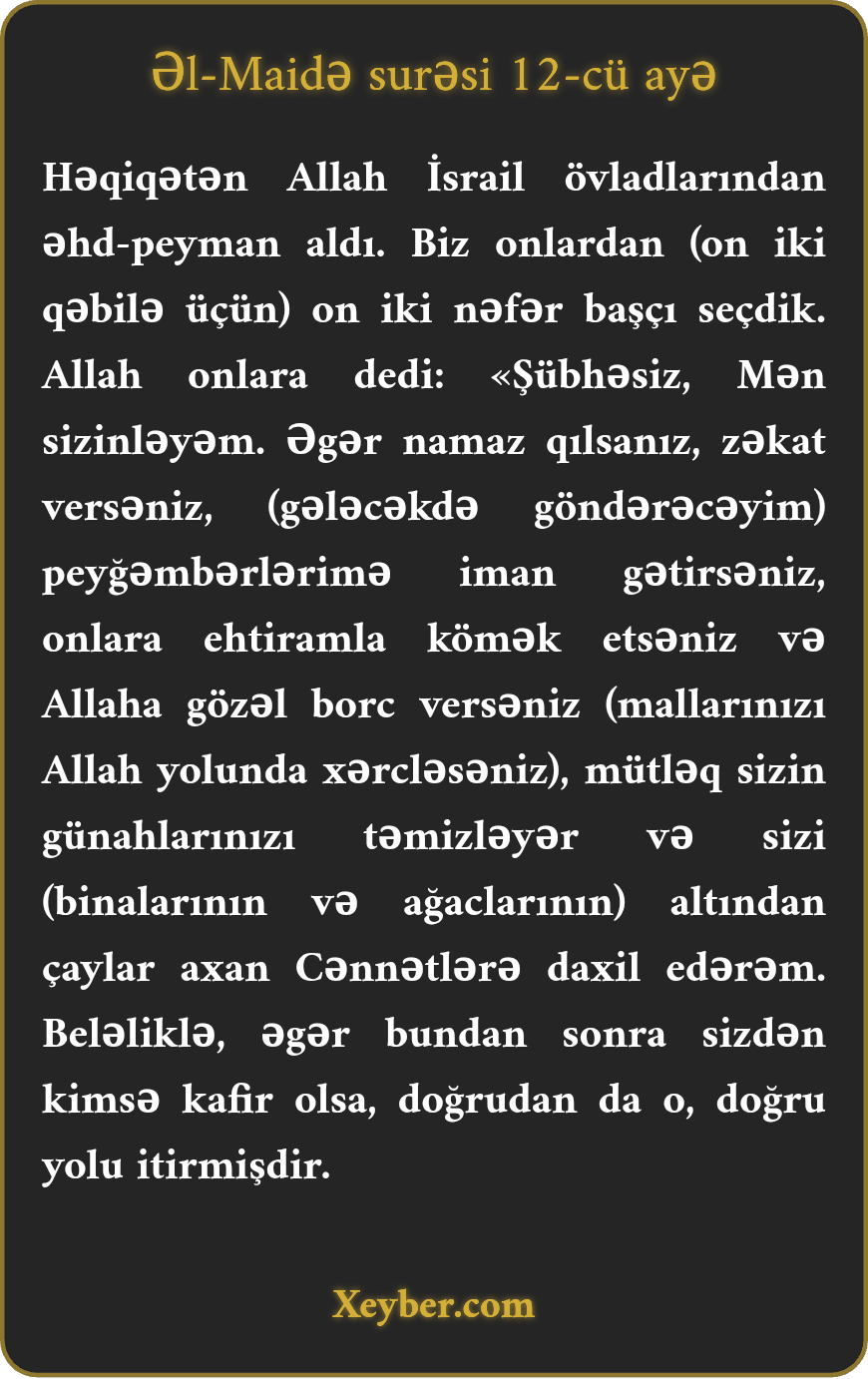 "Həqiqətən, Allah Bəni-İsraildən əhd aldı. Onların arasından (on iki tayfa üçün) on iki rəhbər seçdik. Allah onlara buyurdu: "Mən sizinləyəm. Əgər namazı bərpa etsəniz, zəkat ödəsəniz, peyğəmbərlərimə iman gətirib yardım göstərsəniz, Allaha yaxşı borc versəniz, şübhəsiz, günahlarınızı örtərəm və sizi altından çaylar axan bağlara daxil edərəm. Bundan sonra sizdən kim kafir olsa, həqiqətən, doğru yoldan azmışdır.”