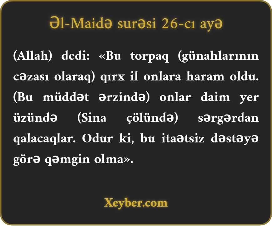 "(Allah Musaya) buyurdu: "Doğrudan da, o (müqəddəs yer) qırx ilədək onlara qadağan olundu. (Süstlük və müxalifətçiliklərinə xatir bu uzun müddəti) yer, üzündə avara qalacaqlar. Bu günahkar qövmə görə təəssüf etmə.”