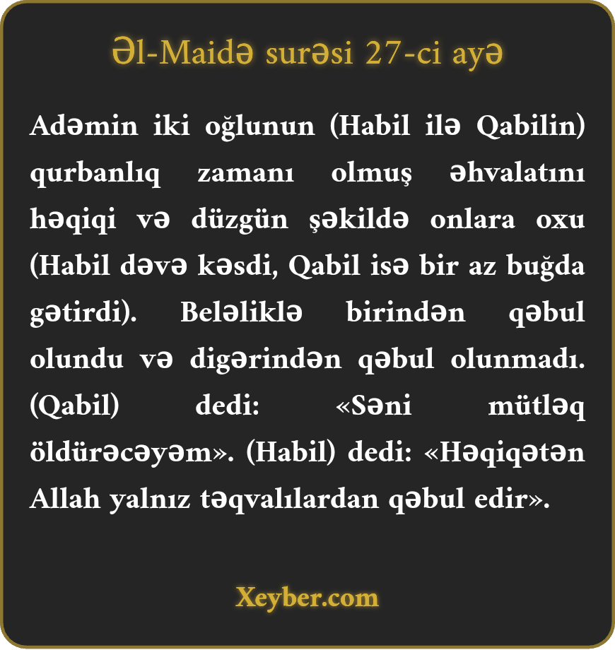 "(Ey peyğəmbər,) Adəmin iki oğlunun əhvalatını xalqa olduğu kimi oxu. O zaman ki, (onlardan hər biri) qurbanlıq gətirdi, birindən (Habildən) qəbul olundu, o birindən (Qabildən) qəbul olunmadı. (Qabil) dedi: "Səni hökmən öldürəcəyəm.” (Habil) dedi: "Allah yalnız təqvalılardan qəbul edir.”