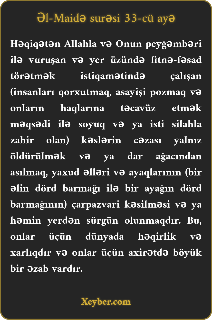 "Həqiqətən, Allah və Onun rəsulu ilə savaşa qalxanların, (silah, hədə, qarətlə) yer üzündə fəsad törətməyə çalışanların cəzası budur ki, ya öldürülsünlər, ya dara çəkilsinlər, ya əl-ayaqları çarpazı kəsilsin, ya da yerlərindən sürgün olsunlar. Bu onların zillət dolu dünyəvi cəzalarıdır və axirətdə onlar üçün böyük bir əzab var.”