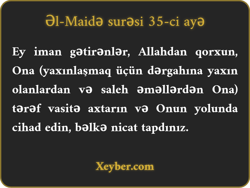 "Ey iman gətirənlər! Allahdan çəkinin və Ona doğru (yaxınlaşmaq üçün) vəsilə axtarın. Onun yolunda cihad edin. Bəlkə nicat tapasınız.”