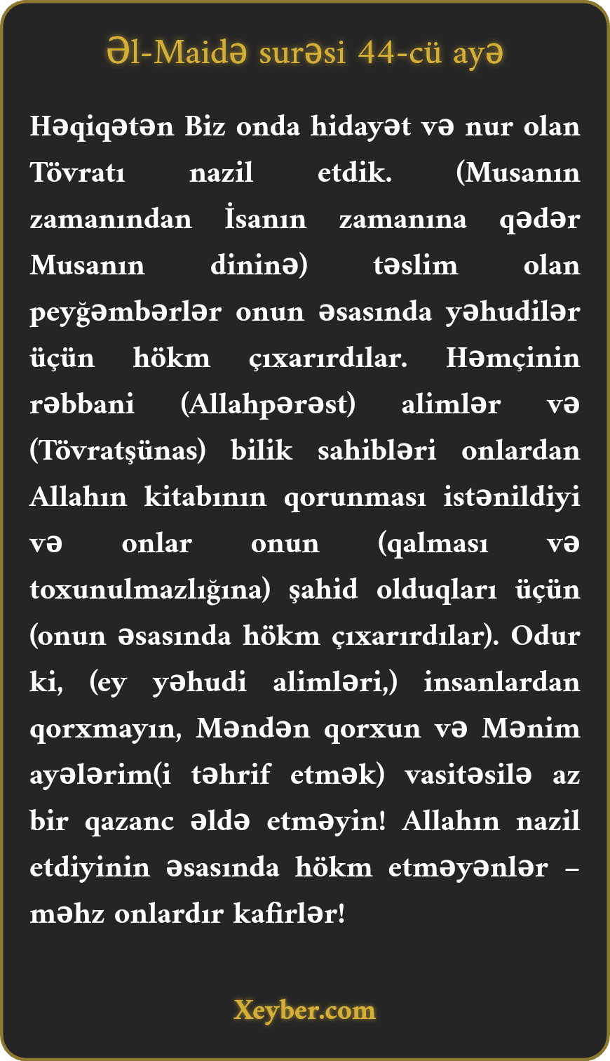 "Həqiqətən Biz Tövratı nazil etdik, onda hidayət və nur var. Allahın fərmanlarına təslim olmuş ilahi tərbiyəçilər onun əsasında yəhudilərə hökm verirdilər. (Eləcə də) ilahi mürəbbilər və alimlər qorunması üçün tapşırıq aldıqları və şahid olduqları səmavi kitab əsasında hakimlik edirdilər.( Ey alimlər,) xalqdan qorxmayın. (Allahın hökmlərini bəyan edin!) Məndən qorxun və Mənim ayələrimi ucuz qiymətə satmayın. Allahın nazil etdiyi əsasında hökm etməyənlər həmin kafirlərdirlər.”