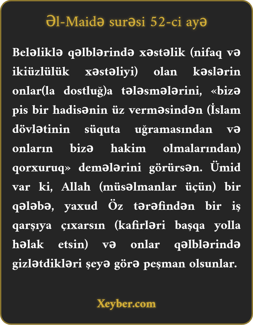 "(Bir bu qədər xəbərdarlığa baxmayaraq) qəlbi xəstə olanları kafirlərlə dostluğa tələsən görürsən. (Onlar öz işlərinə don geyindirib) deyirlər: "Qorxuruq ki, pis bir hadisə ilə üzləşək (onların köməyinə möhtac olaq).” Ümid var ki, Allah Öz tərəfindən bir qələbə və ya müsəlmanların xeyrinə) bir iş önə çıxarsın və həmin vaxt onlar qəlblərində gizlətdiklərinə görə peşman olsunlar.”