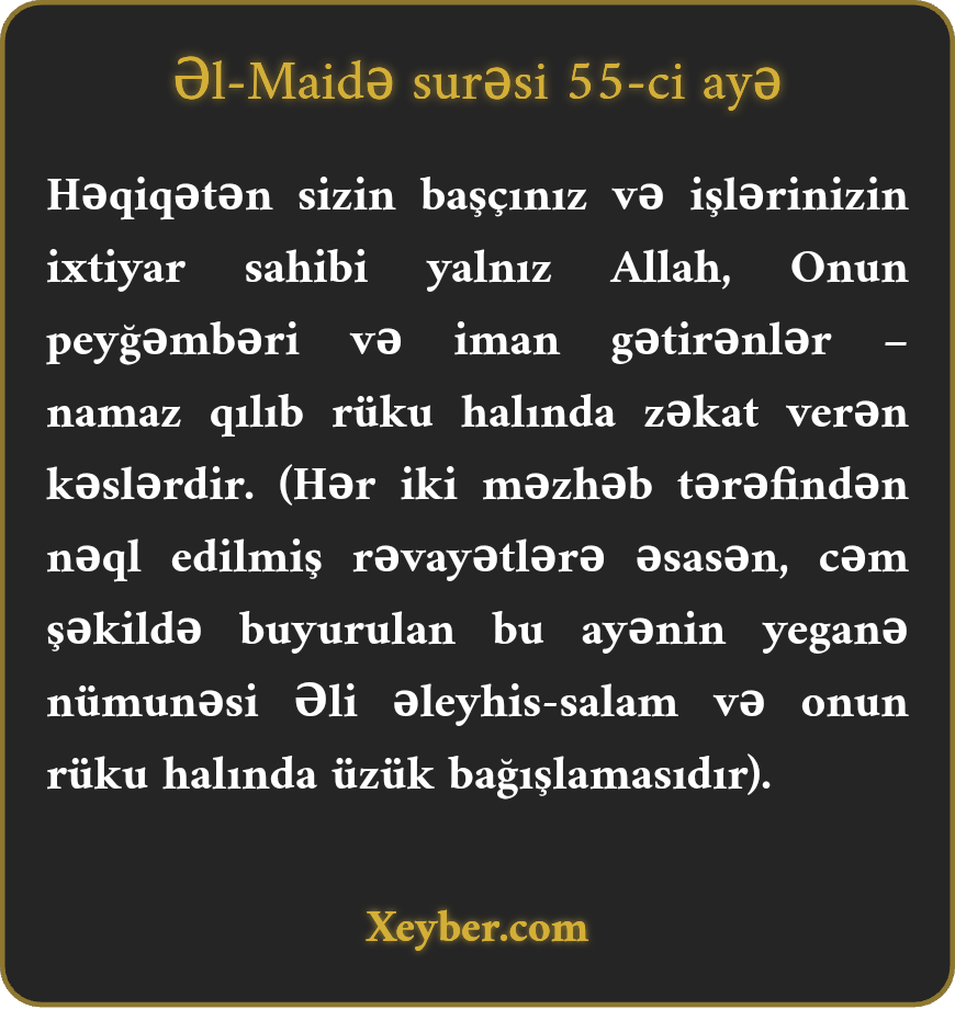 "Sizin rəhbəriniz yalnız Allah, Onun peyğəmbəri və namazı bərpa edib rüku halında zəkat verən möminlərdir.”