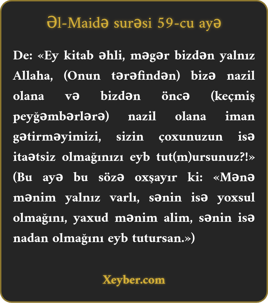 "De ki, ey kitab əhli! Bizə bunu irad tutursunuzmu ki, Allaha, bizə nazil olana və əvvəldən nazil olana iman gətirmişik? Həqiqətən, sizin çoxunuz haqq sərhədindən çıxmışsınız və günahkarsınız.”